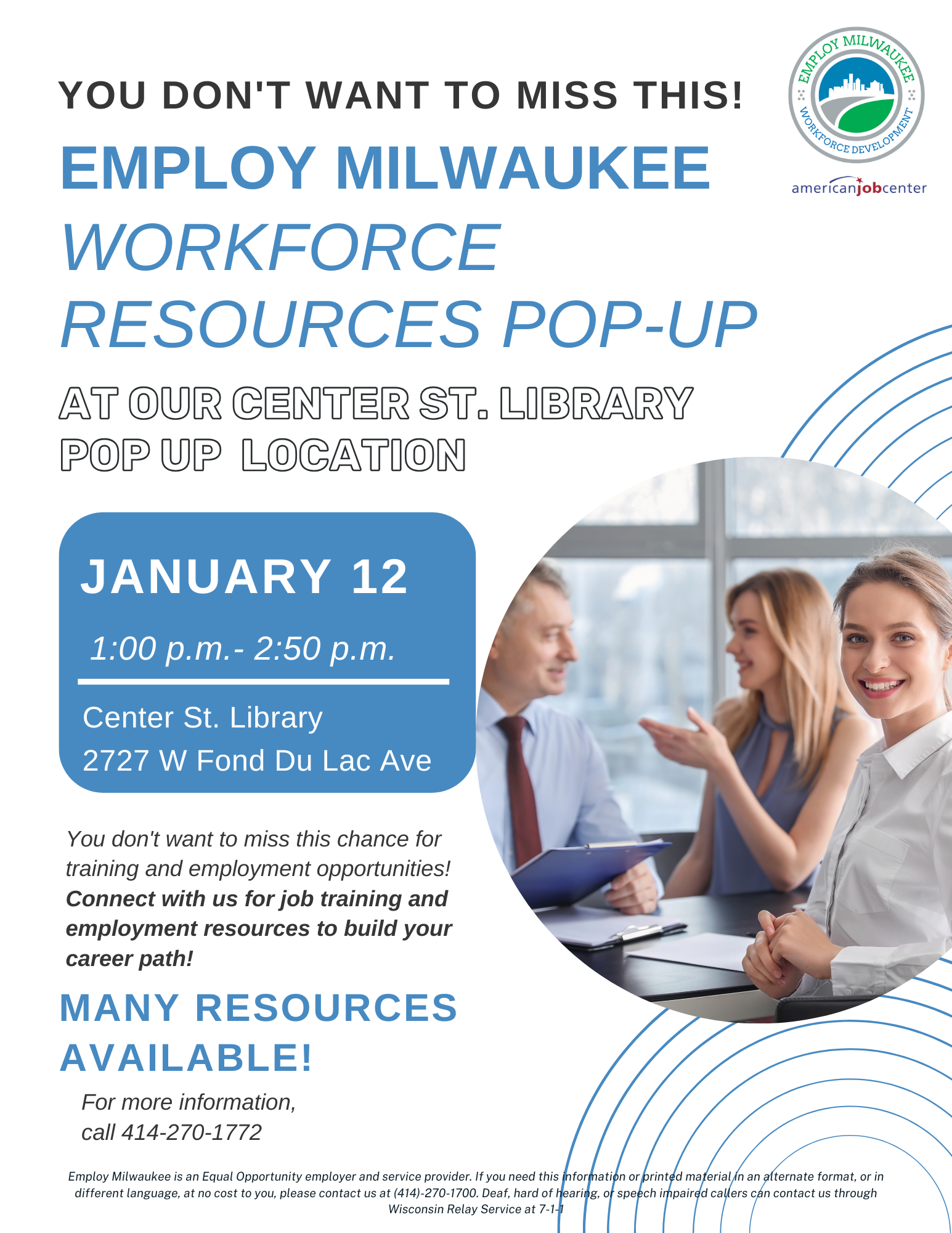 Employ Milwaukee is an Equal Opportunity Employer and Service Provider. If you need this information in an alternate format, or in a different language at no cost to you, please contact us at (414) 270-1700. Deaf, hard of hearing, or speech impaired callers can contact us through Wisconsin Relay Service at 711.