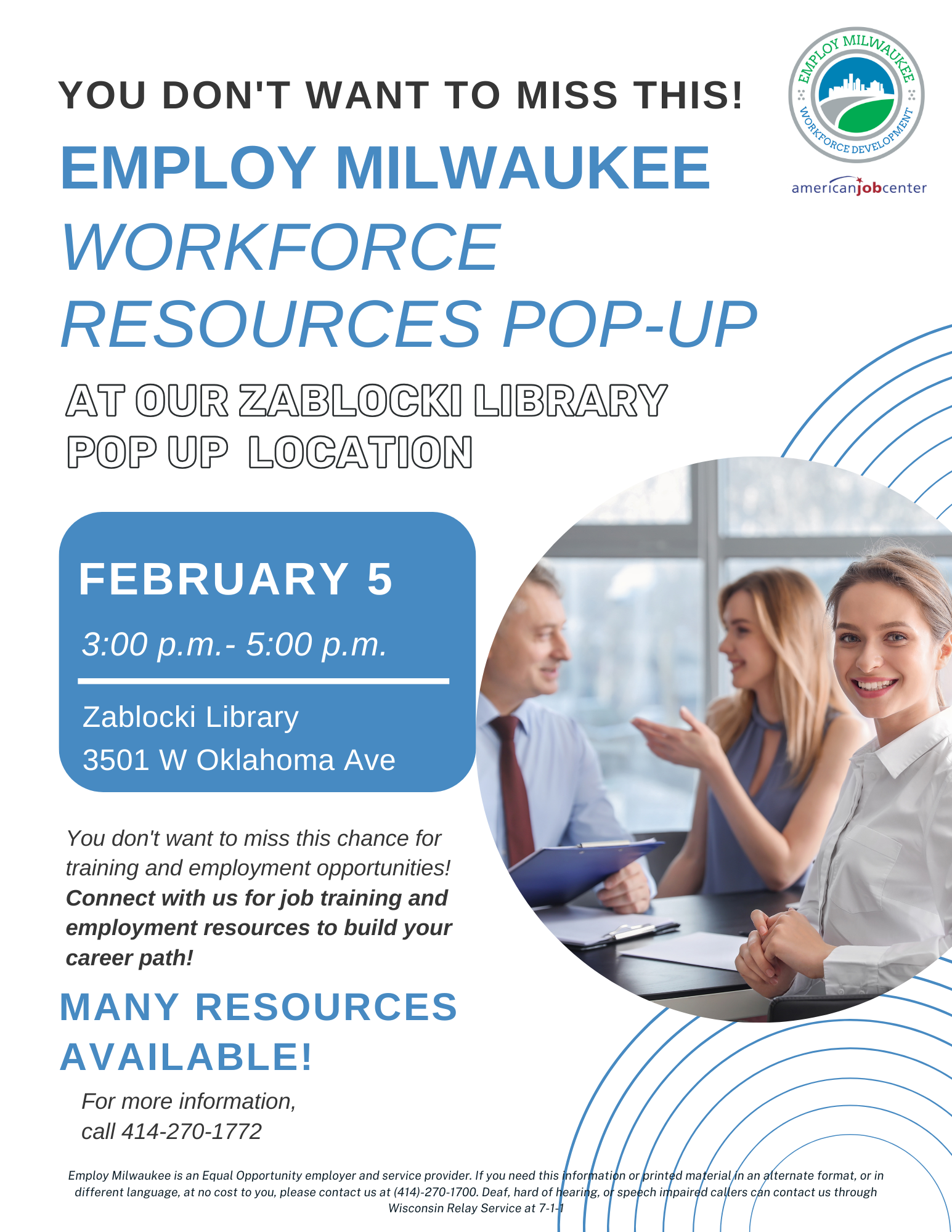 Employ Milwaukee is an Equal Opportunity Employer and Service Provider. If you need this information in an alternate format, or in a different language at no cost to you, please contact us at (414) 270-1700. Deaf, hard of hearing, or speech impaired callers can contact us through Wisconsin Relay Service at 711.